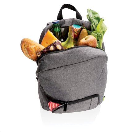 600D two-tone polyester large cooler bag can store up to 20 cans. With 2 mesh side pockets and 1 front pocket.