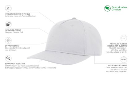 Šilterica 5 panela, od recikliranog poliestera s UV zaštitom i tretmanom koji odbija vodu. Srednji vizir, dry-tech traka za znojenje i gumeno kopčanje na čičak. Pogodan za sunčane i kišne vremenske uvjete. Reciklirani poliester (rPET) je materijal dobiven recikliranjem korištenih plastičnih boca. Ovim postupkom dobivaju se novi polimeri koji se pretvaraju u tekstilna vlakna koja se zauzvrat mogu ponovno reciklirati kako bi dali život drugim plastičnim predmetima.