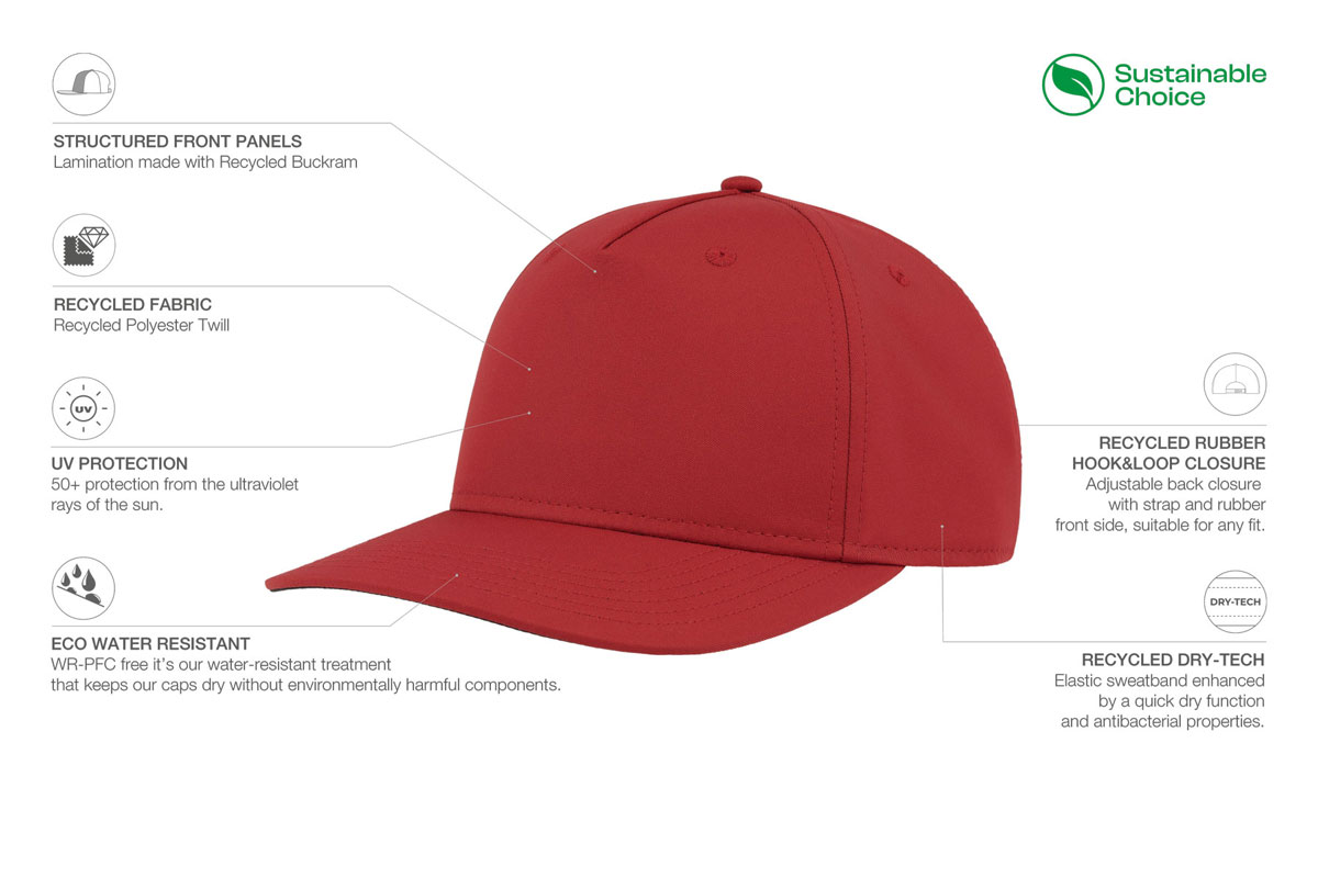 Šilterica 5 panela, od recikliranog poliestera s UV zaštitom i tretmanom koji odbija vodu. Srednji vizir, dry-tech traka za znojenje i gumeno kopčanje na čičak. Pogodan za sunčane i kišne vremenske uvjete. Reciklirani poliester (rPET) je materijal dobiven recikliranjem korištenih plastičnih boca. Ovim postupkom dobivaju se novi polimeri koji se pretvaraju u tekstilna vlakna koja se zauzvrat mogu ponovno reciklirati kako bi dali život drugim plastičnim predmetima.