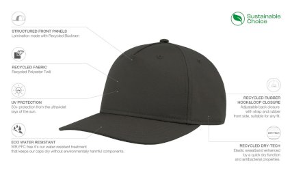 Šilterica 5 panela, od recikliranog poliestera s UV zaštitom i tretmanom koji odbija vodu. Srednji vizir, dry-tech traka za znojenje i gumeno kopčanje na čičak. Pogodan za sunčane i kišne vremenske uvjete. Reciklirani poliester (rPET) je materijal dobiven recikliranjem korištenih plastičnih boca. Ovim postupkom dobivaju se novi polimeri koji se pretvaraju u tekstilna vlakna koja se zauzvrat mogu ponovno reciklirati kako bi dali život drugim plastičnim predmetima.