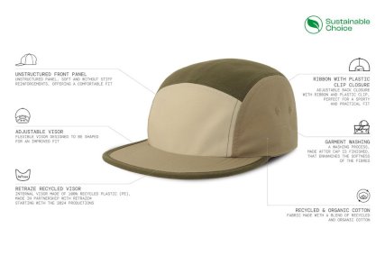 Kamperska kapa s 5 panela izrađena od organskog i recikliranog pamučnog platna, s plastičnom kopčom i elastičnom petljom. Dobar izbor za tisak sprijeda. Ističe se po recikliranom viziru koji je izrađen od odbačenih ribarskih mreža.