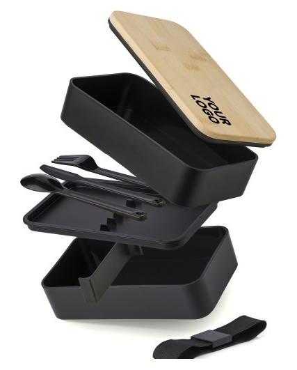 Lunch box, Maxton, dvoslojna, sa dva odjeljka, bamboo poklopac, crna