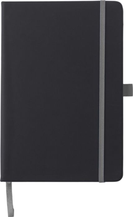Notes A5, tvrdih korica, crne boje, sa elastičnom trakom u boji, 96 stranica sa linijama, vrpcom za stranice i držačem za kem.olovku. Kod laserske gravure, dizajn je iste boje kao i elastična traka.