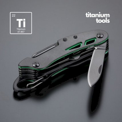 Optima džepni nož u novom ruhu, izrađen od visokokvalitetnog nehrđajućeg čelika s premazom od titana za poboljšanu tvrdoću i dodatnu otpornost na koroziju. Sadrži: škare, nož, pila za drvo, otvarač za boce i konzerve, strugač za ribu, vadičep, bušilica, urezivač konca (za krpanje zračnica, šivanje splavi za jedra, krpanje gume), turpija za nokte i Phillips odvijač.