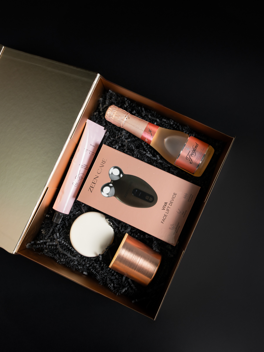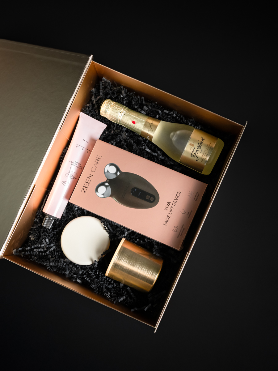 Paket sadrži pažljivo odabrane proizvode pakirane u rose gold poklon kutiji s ukrasnom vrpcom, Mikrostrujni uređaj za lifting licaMaska za lice, 100 mlogledalo s LED svjetlomlsvijeća u zlatnoj bojiFreixenet gold 0,2l *brendiranje nije uključeno u cijenu
