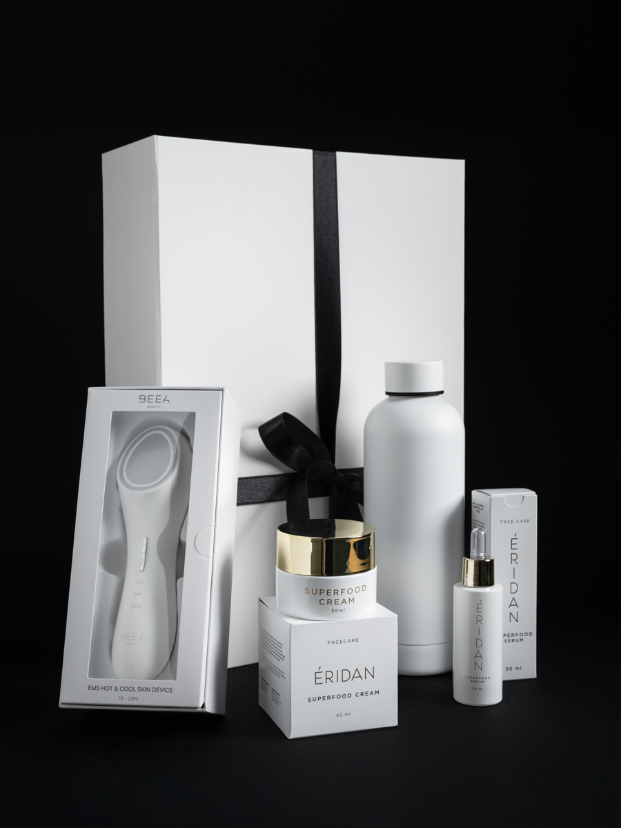 Paket sadrži pažljivo odabrane proizvode pakirane u bijeloj poklon kutiji s ukrasnom vrpcom, Face lift uređaj za liceserum za lice Superfood za smanjivanje bora, hidrataciju i zaglađivanje kožekremu za lice Superfood i bocu za vodu *brendiranje nije uključeno u cijenu