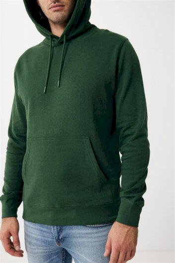 Izdržljiva kombinacija od kružno tkanog pamuka i poliestera: srednje teški sweatshirt s kapuljačom za muškarce s češljanom unutarnjom stranom, džepom u obliku tobolca te elastičnim, rebrastim pasicama na rukavima i obrubu.