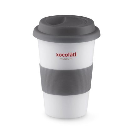 Šalica keramička sa silikonskim poklopcem i zaštitnom trakom, siva
