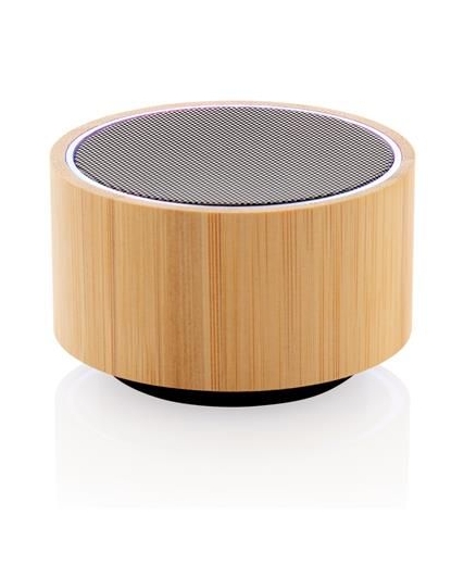 Promotivni bežični 3W zvučnik s kućištem od bamusa. Eco friendly. Punjiva baterija od 300 mAh omogućuje vrijeme reprodukcije glazbe do 3 sata s jednim punjenjem i udaljenost povezivanja do 10 metara s Bluetooth 4.1. Uključuje mikro USB kabel za punjenje i audio kabel za povezivanje uređaja s mobilnim telefonom . Dodatak ambjentalno svjetlo. Dorada loga ili reklamne poruke tehnikom gravure i li tiska.